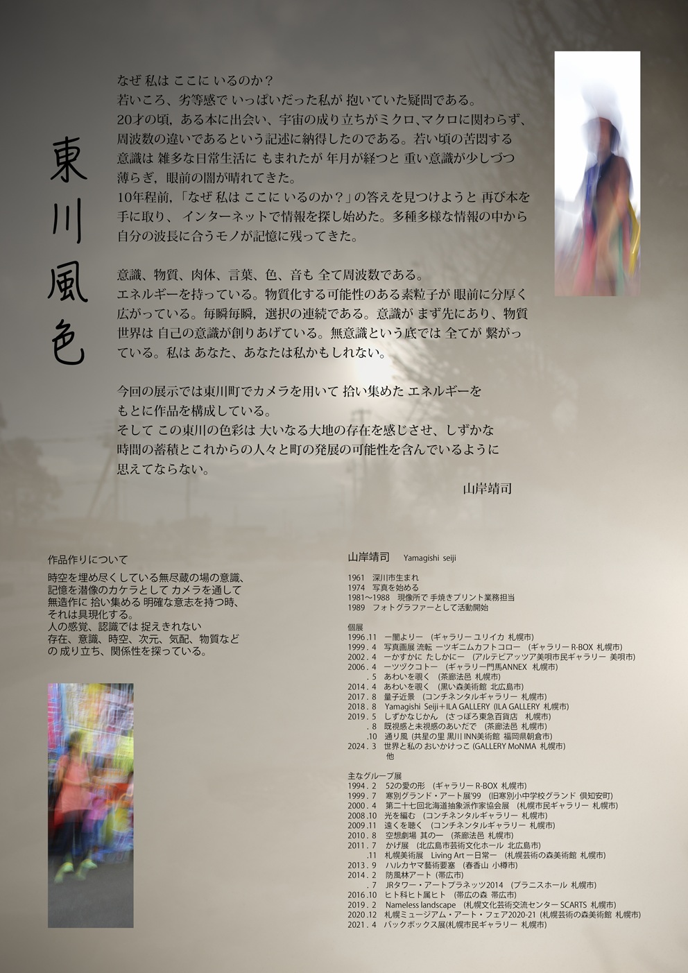 問いを追求する山岸氏は、意識や色や音、全ては周波数であり、エネルギーを持っているという考えのもと、人の感覚や認識では捉えきれないそれらの成り立ちや関係性を探りながら作品を作っています。今回の写真展では、東川町のエネルギーがつまった大いなる大地の存在を感じさせる作品が並びます。ぜひご覧ください。