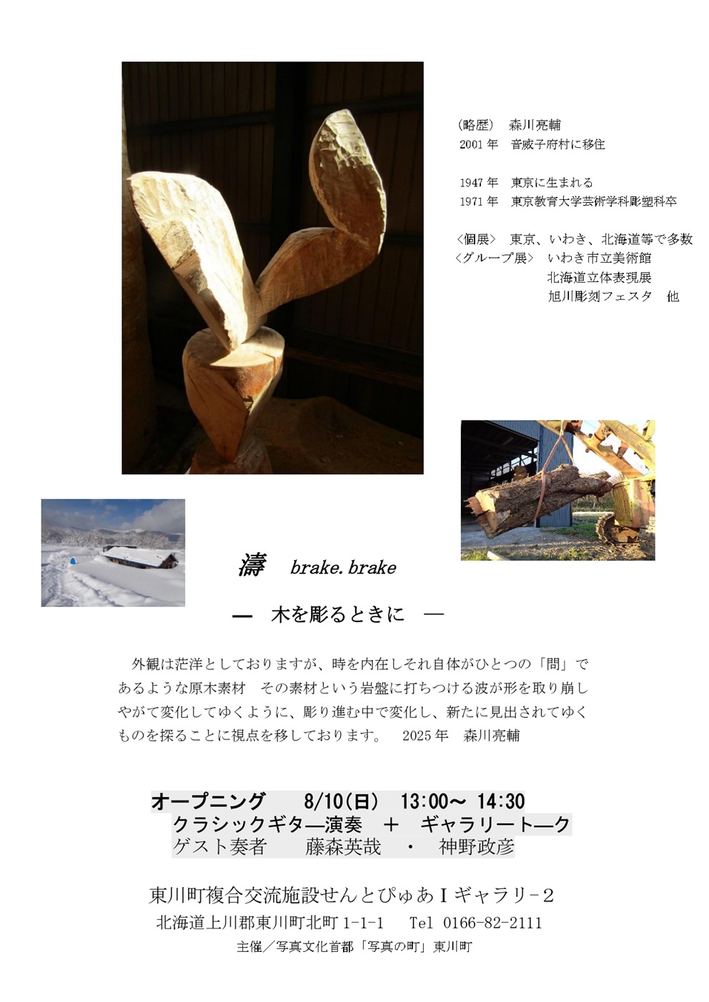 また、オープニングの8月10日(日)13:00~は、森川氏と親交のある藤森英哉氏、神野政彦氏をお招きし、3名によるクラシックギター演奏も行います。木の作品空間に木の音が創り出すもう一つの場を、どうぞお楽しみください。
