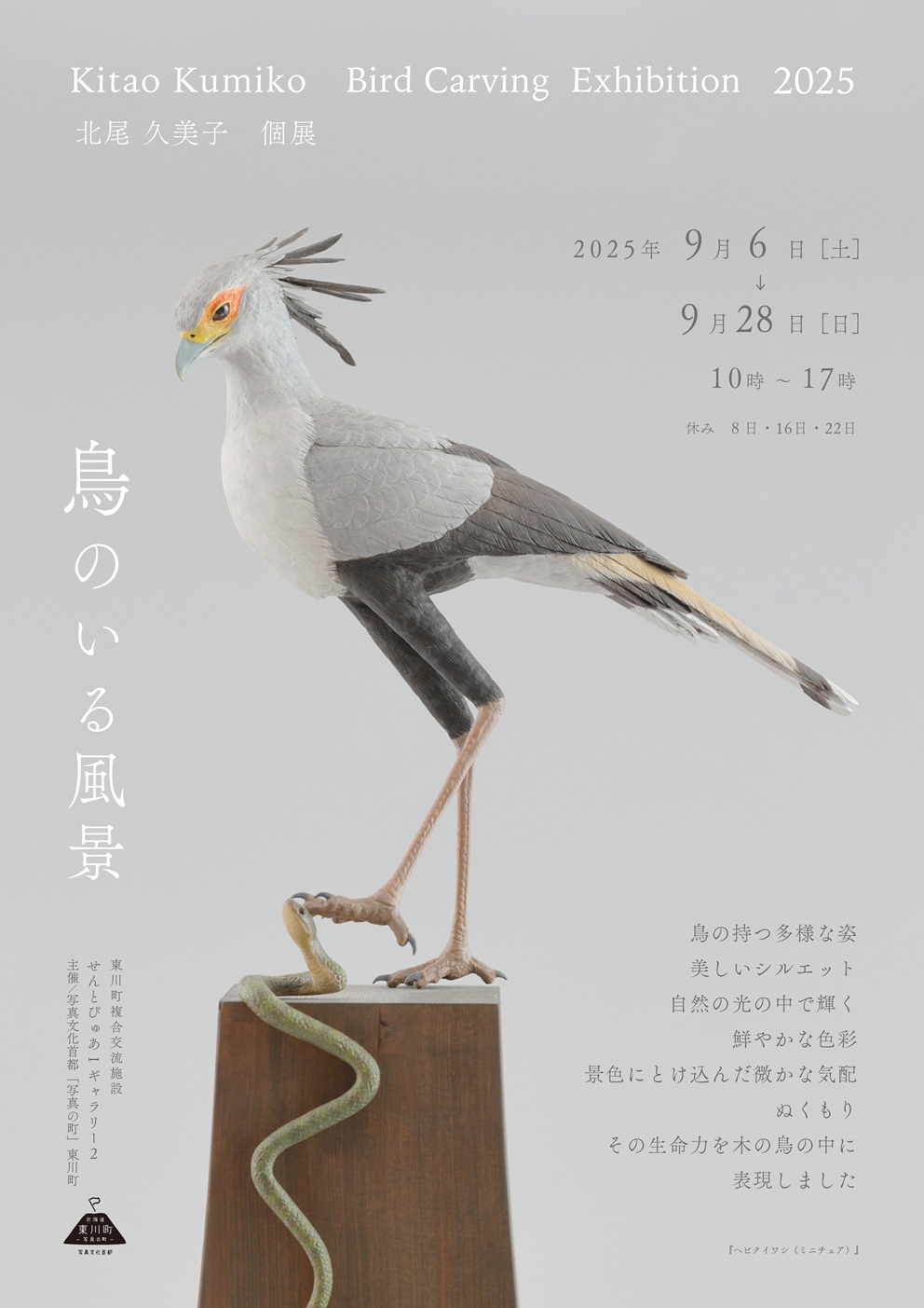 オープニングの9月6日には、午後3時より作家の北尾氏によるトークイベントも開催予定です。作品説明や野鳥についてのお話を通して、展示をお楽しみいただけます。