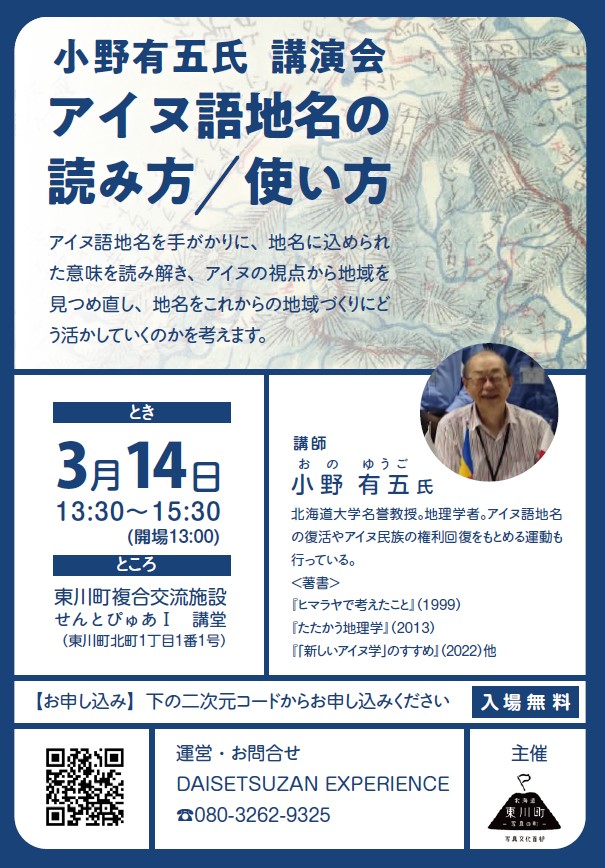 今回は、アイヌ語地名を手がかりに、地名に込められた意味を読み解きます。日本語訳だけでは見えにくい、アイヌの視点から地域を見つめ直し、地名をこれからの地域づくりにどう活かしていくのかを考えます。
