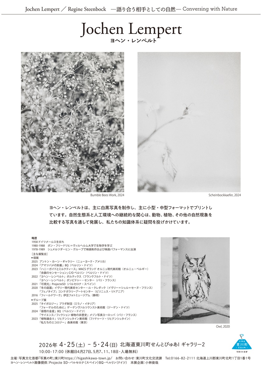 本展では、映画監督としても活動し多数の映像作品を制作するレギーネ・スティーンボック氏の作品と、主に白黒写真を制作し世界各地で多数の展覧会を開催するヨヘン・レンペルト氏の作品をご覧いただけます。皆様のお越しをお待ちしております。