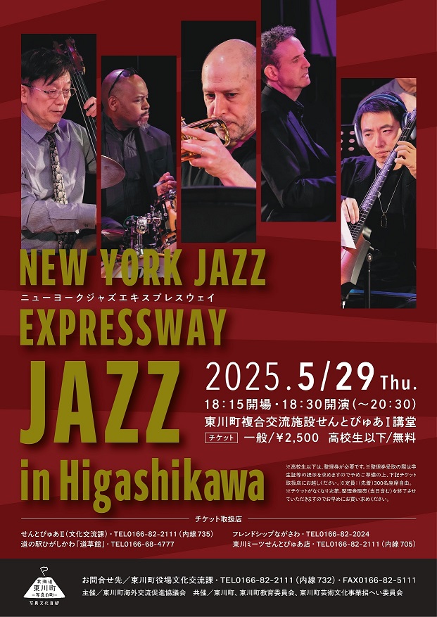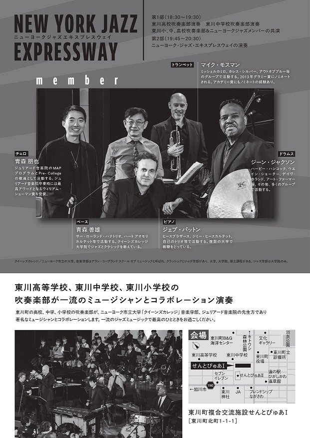 2025.05.12東川ゆかりのベーシスト、青森善雄さんとニューヨーク・ジャズ・エクスプレスウェイのメンバーを招き、東川町の子どもたちとの吹奏楽によるコラボレーションコンサートを開催します。