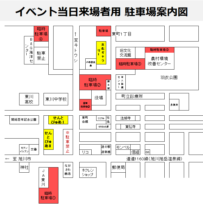 下記の案内図をご確認のうえ、JAひがしかわや東川町役場などお近くの公共駐車場をご利用ください。地図記載以外の場所や道路上には駐車することのないよう、ご協力をお願いいたします。