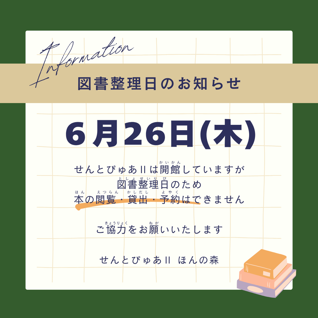 6/26 図書整理日のお知らせ(せんとぴゅあⅡほんの森)