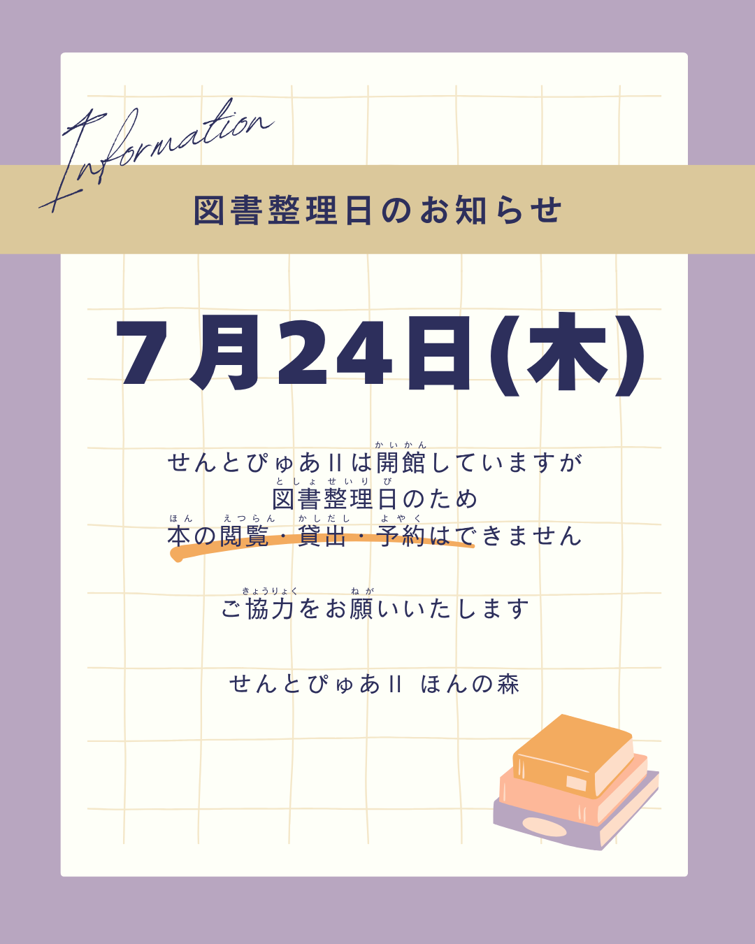 7/24 図書整理日のお知らせ(せんとぴゅあⅡほんの森)