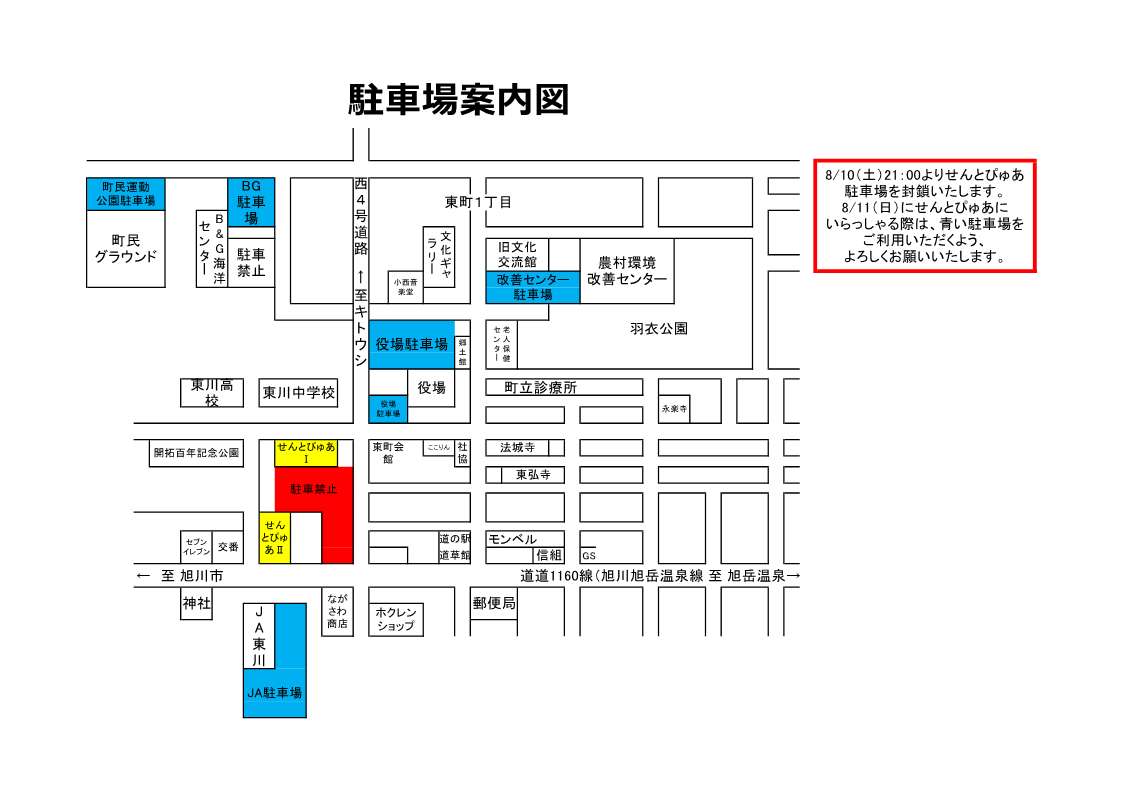当日せんとぴゅあをご利用の方は、添付の地図を参考にJAひがしかわ駐車場や役場駐車場などお近くの公共駐車場をご利用ください。