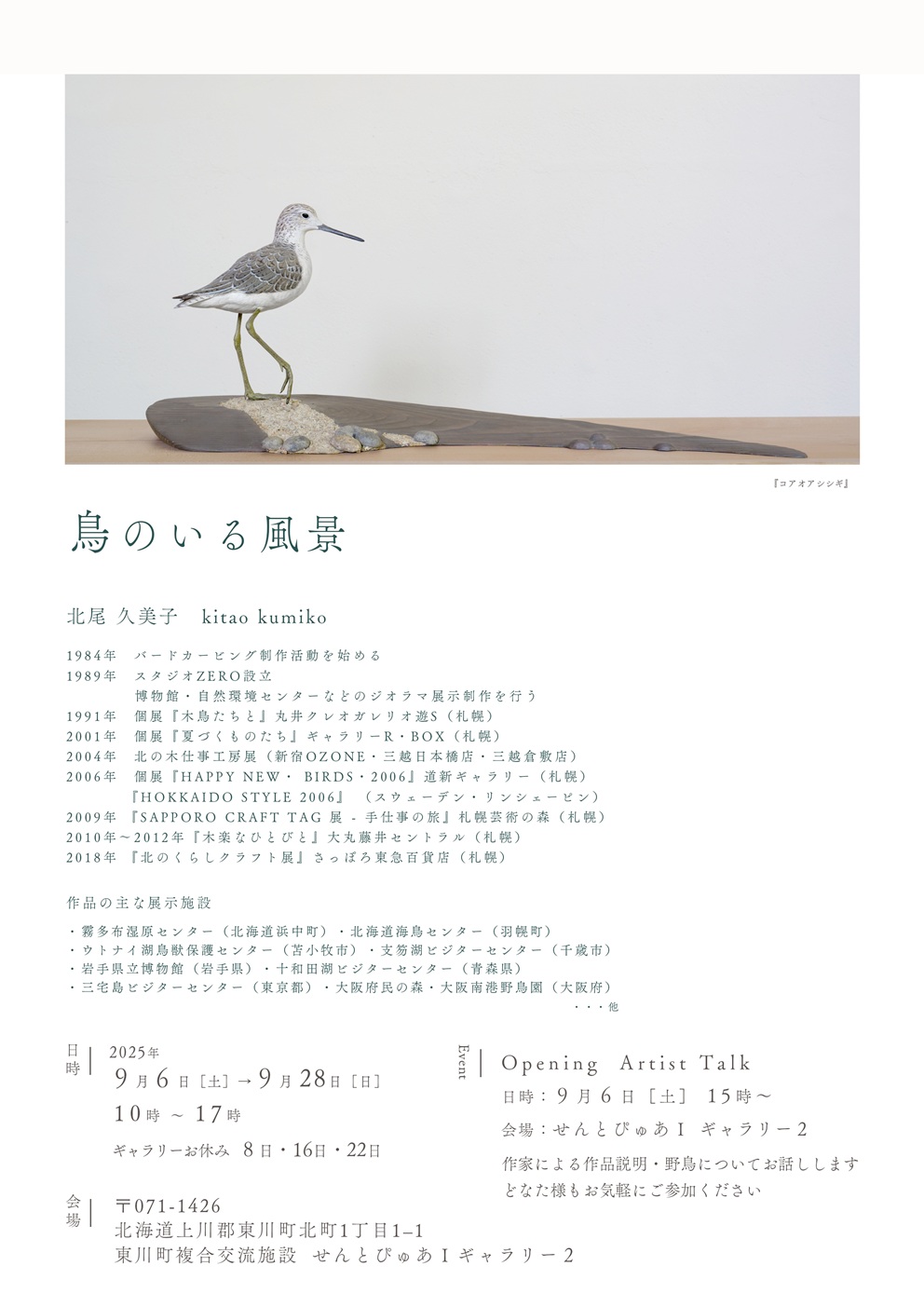 オープニングの9月6日には、午後3時より作家の北尾氏によるトークイベントも開催予定です。作品説明や野鳥についてのお話を通して、展示をお楽しみいただけます。