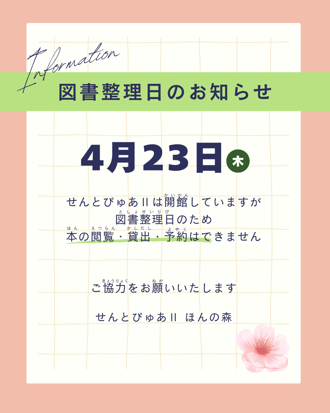 4/23図書整理日のお知らせ(せんとぴゅあⅡほんの森)