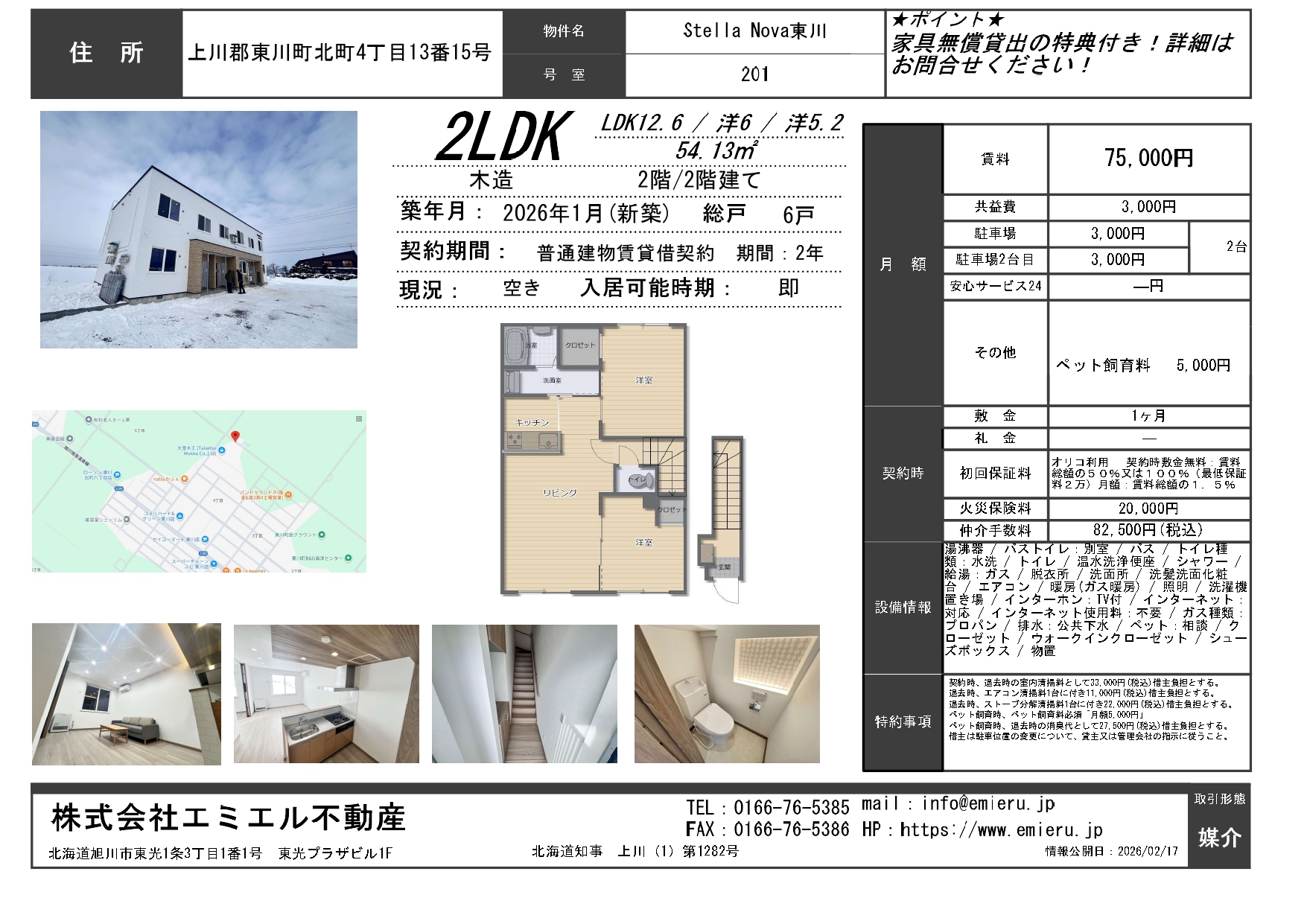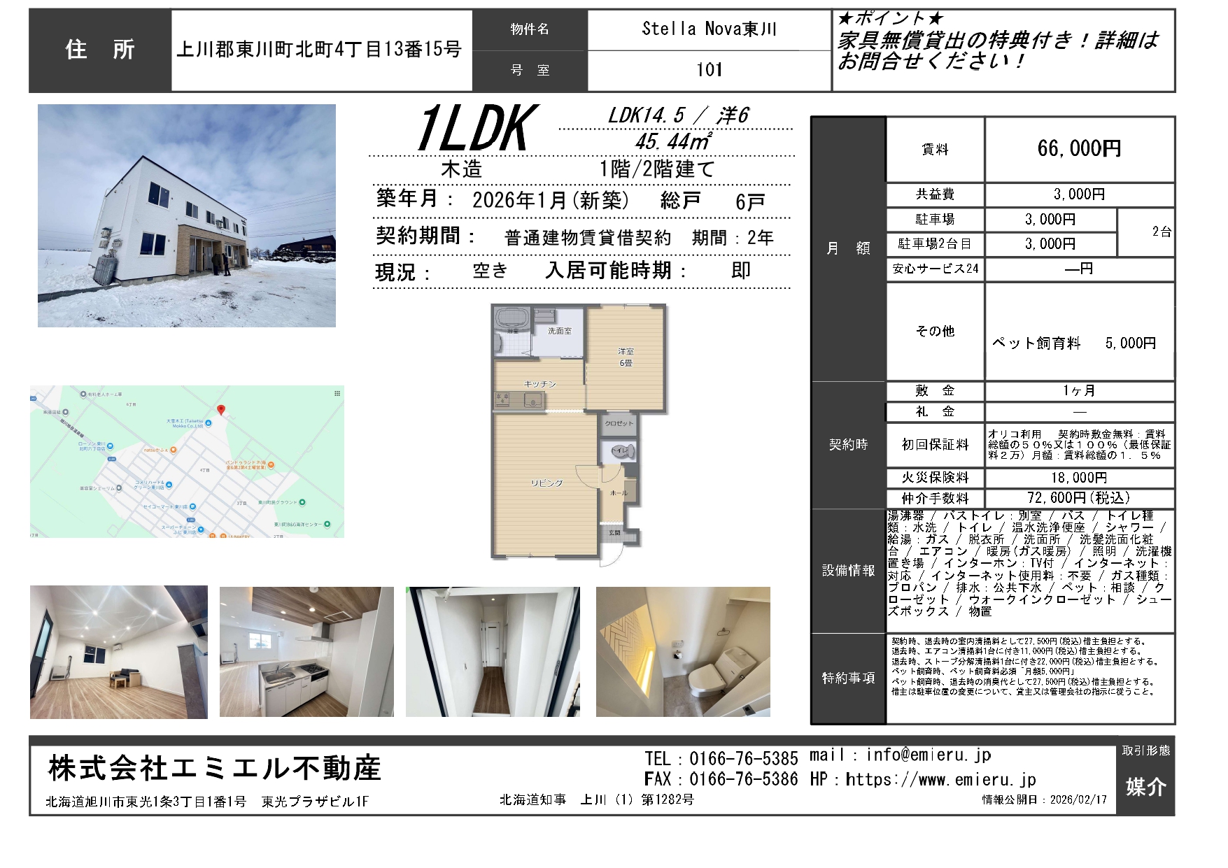 2026年1月末完成/即入居可能 ・新築/未入居 ・保証会社要加入 ・火災保険要加入 ・ペット飼育要相談 ※ペット飼育時:ペット飼育料 月額5,000円 ・駐車2台目可能 ・ガス指定有 ・ガス料金定額制 ・インターネット無料 ・家具無償貸出 【2/5時点の空室状況】 ・1階 1LDK/101号室 ・1階 1LDK/103号室 ・2階 2LDK/201号室 ・2階 2LDK/202号室