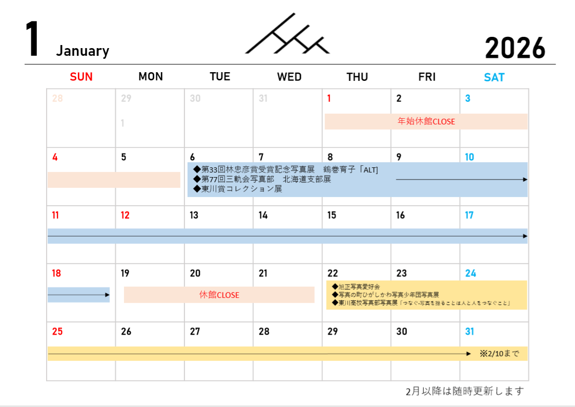 2026年1月の予定表が出来上がりました。大変お待たせしてしまい申し訳ありません。1月は、6日㈫10:00からの開館となります。