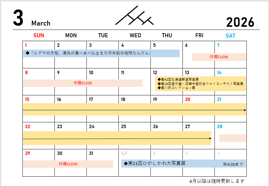 写真展開催予定と休館日のお知らせ~3月~