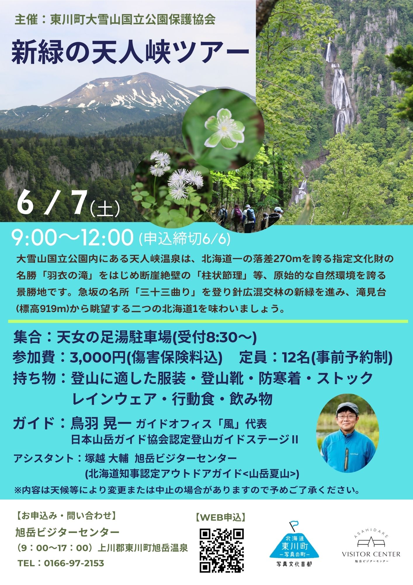 大雪山国立公園内に位置し、北海道1の落差を誇る「羽衣の滝」や、北海道1の最高峰「旭岳」と、二つの北海道一が見られる「滝見台」を目指します。
