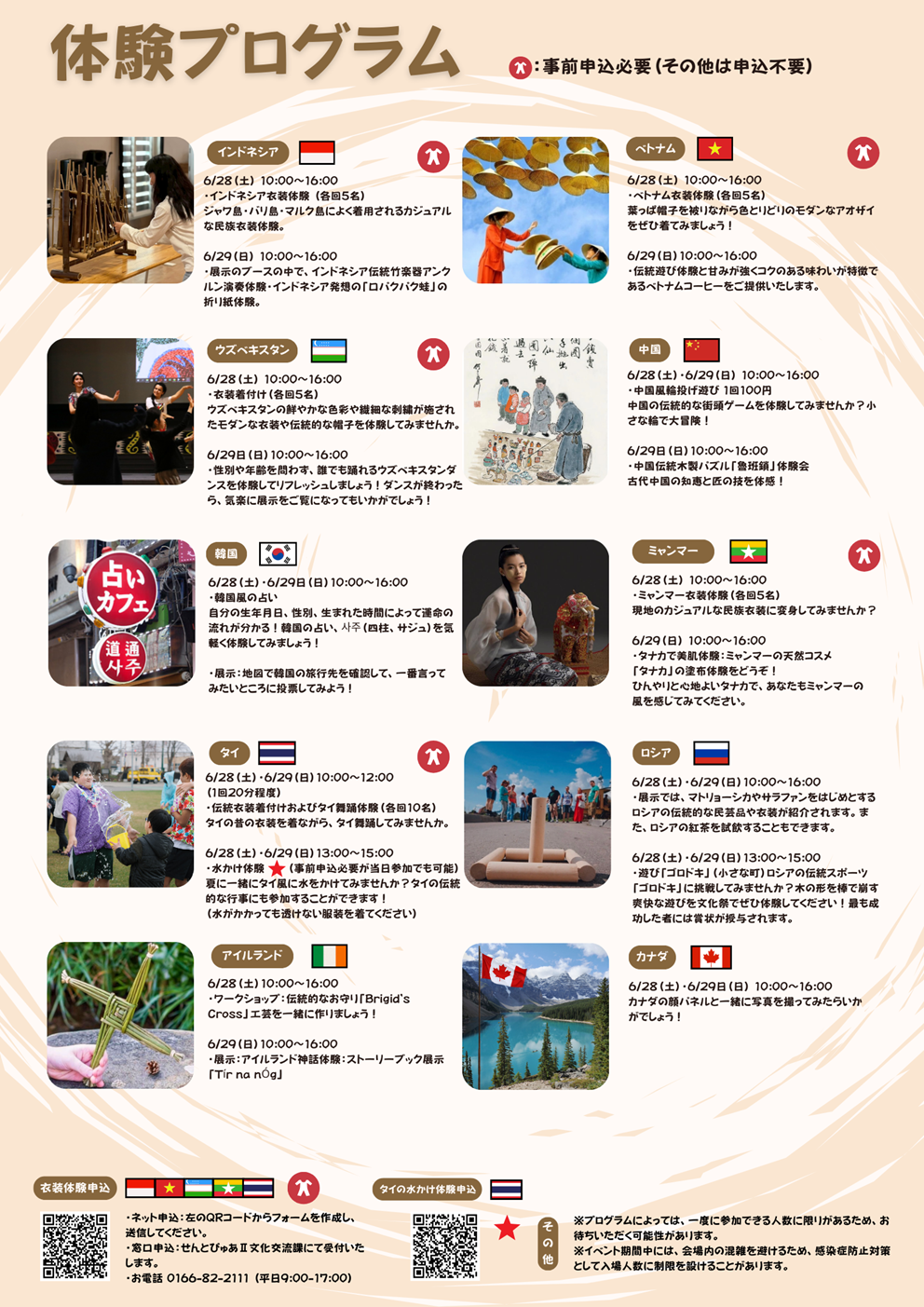 本イベントでは、伝統的なダンスや遊び、占い、民族衣装の着付けなど、オリジナリティあふれる体験型の企画を多数ご用意。各国の文化ブースを通じて、親しみやすい国際交流の場をご提供いたします。