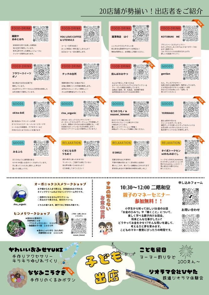内 容:町内外の写真を愛する者たちによるストリート作品展。今年は一般部門・ジュニア部門(中学生以下)の募集を行い、各部門でグランプリ(1名)・準グランプリ(2名)を選出。グランプリ受賞者にはニコンミラーレスカメラを副賞としてお渡しします。※募集についてはHP・ブログ・SNSで告知します。
