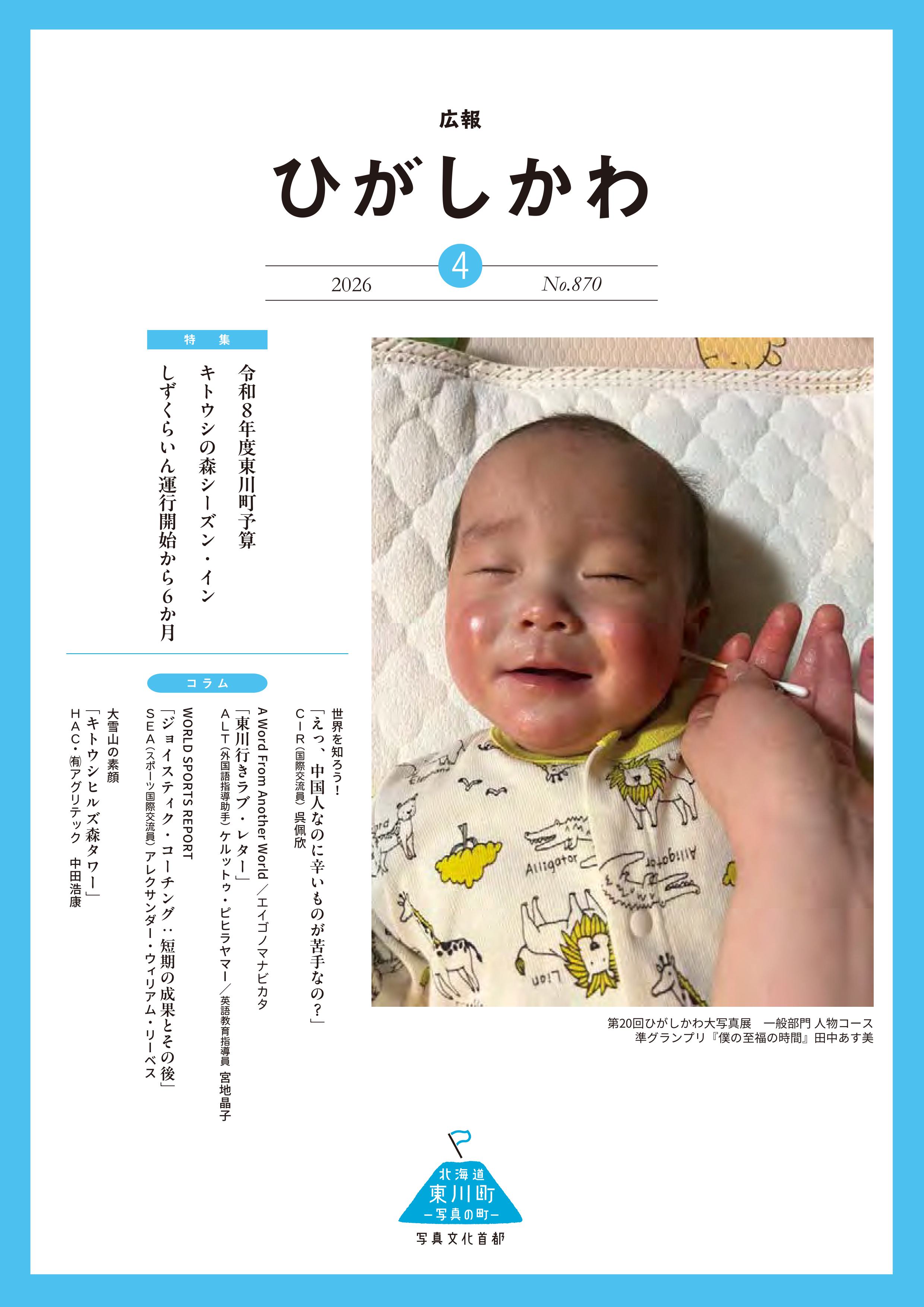 くらしのガイド 広報ひがしかわ バックナンバー 広報ひがしかわ 令和8年4月号 No.870 CONTENTS 1.全ページ(PDF) 7.76MB 2.表紙『僕の至福の時間』(PDF) 3.目次(PDF) 4. 令和8年度 東川町予算 (PDF) 5.人事異動のお知らせ (PDF) 6.キトウシの森シーズンイン (PDF) 7.乗合バスしずくラインの利用状況について(PDF) 8. ほんの森司書のオススメ_本でめぐる世界_世界を知ろう(PDF) 9. A Word From Another World (PDF) 10. コンディショニング通信_WORLD SPORTS (PDF) 11. 大雪山の素顔_俳句(PDF) 12. 町長コラム_まちを想う_協力隊(PDF) 13.くらしの情報(PDF) 14. 子どもの心の健康講座(PDF) 15.イベントカレンダー(PDF) 16.ギャラリー展示情報(PDF) 17.各種連絡先_世界のデザイン(PDF) 折込チラシ ※町外の方へ:東川町民にのみ適用される内容のものもありますので、ご了承ください。 班回覧チラシ(PDF) 全戸配布チラシ(PDF)