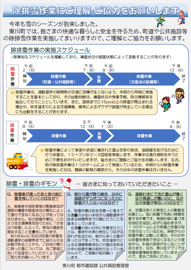 冬の暮らしが少しでも快適なものとなるように、町の除雪の仕組みや考え方、寄せられる疑問に対する解説などを通して、皆さまにも知っておいていただきたい事柄についての啓発紙面です。