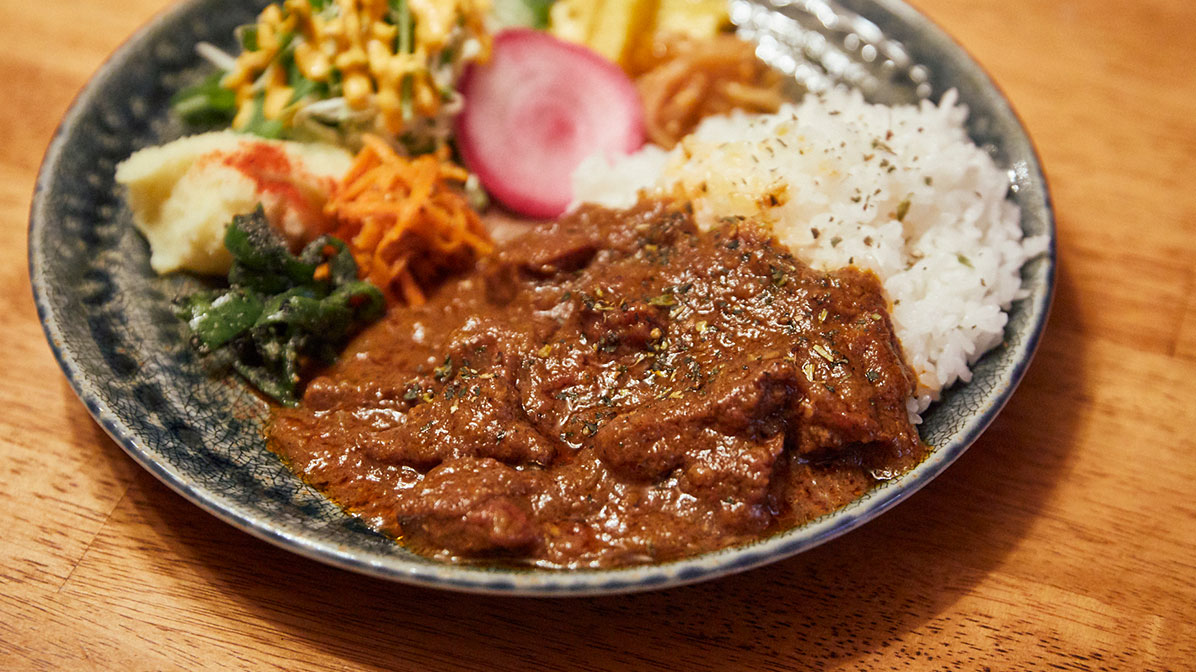 長男に小麦と卵のアレルギーがあることがわかったのは、生後3か月の時でした。「カレーを食べる、子どものわんぱくな感じがいいなと思っていたんですけど(笑)、カレールーには小麦が入っているので」と眞宏さんはスパイスをブレンドした子ども用のカレーを作りはじめました。ところが、次第にカレー作り自体が楽しくなってきてしまったそう。最終的には30種類ほどのスパイスを使った本格カレーが完成。物件も借りられることになり「自由咖哩」を開業しました。そもそも水がきれいな場所を探してたどり着いた東川町でしたが、お店を始めてからは「特に、水を使わないカレーでは野菜の味がダイレクトに反映されますし」と野菜やお米のおいしさを見直しています。