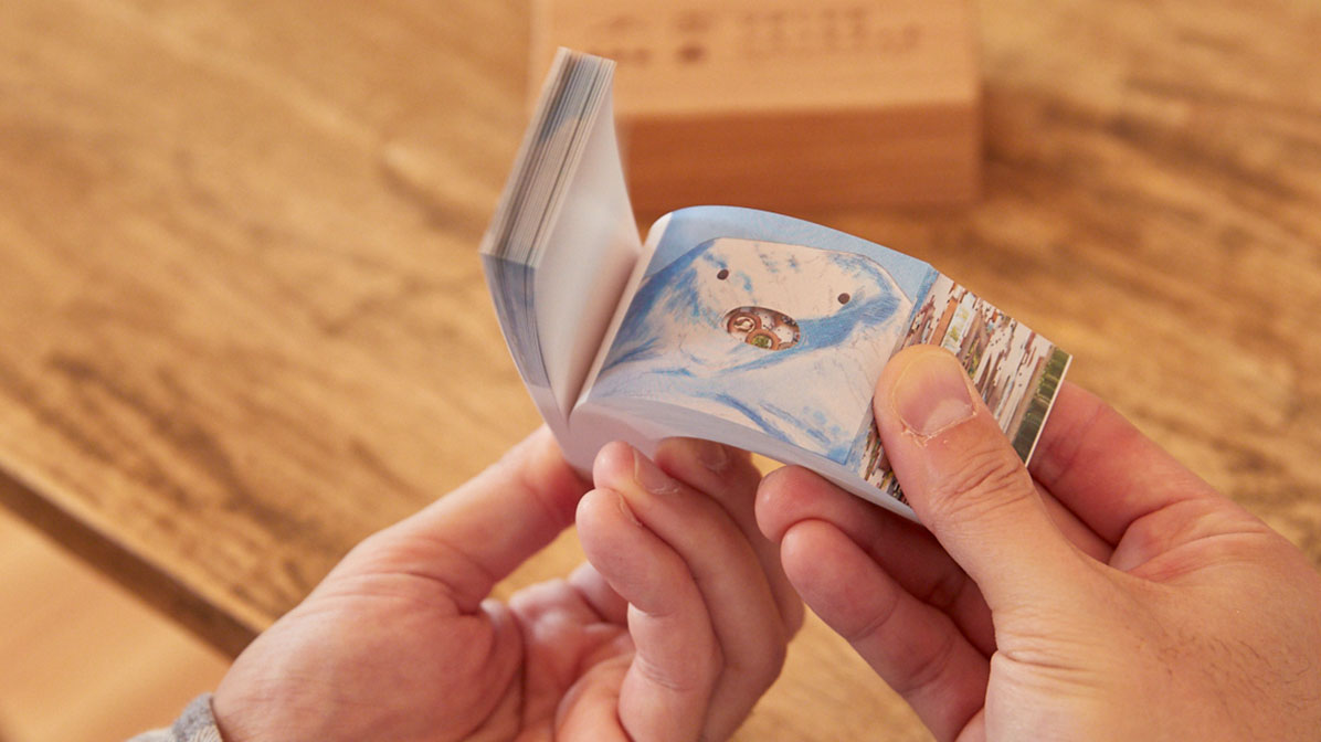 以前は「窓を開けると目の前が隣の家の壁」というような人口の多いエリアで暮らしていたので、東川では家があまり多くないエリアを選びました。息子さんの小学校入学にはギリギリ間に合い、小規模校での学校生活がスタート。町内には全部で4つの小学校があり、規模もそれぞれですが、「うちの子どもには少人数の学校が合っていたと思います」と理奈さんは言います。新しく建てた家には大雪山の景色を切り取るように大きな窓が据えられ、庭には鳥の餌台が置かれています。「毎日自然と触れ合って、きちんと自然と向き合いながら感性を磨いていけるような環境なので、ここで得たエッセンスはおのずと作品に反映されると思います」。何より、行き詰まった時もパッとドアを開けるだけで気分を変えられるのがいい、と公亮さんは笑います。移住から1年経たずに町からコラボ企画が持ち込まれ、「ひがしかわパラパラブック」が誕生。ワークショップの開催も依頼されるなど「町が文化芸術系にエネルギッシュに取り組まれていて、本当にすばらしいと思います」。パラパラまんがは「突き詰めていくと次元を超えた動画のようなものを作れると思っています。研究のしがいがあります」と公亮さん。この環境でどんな作品が誕生するのか楽しみです。