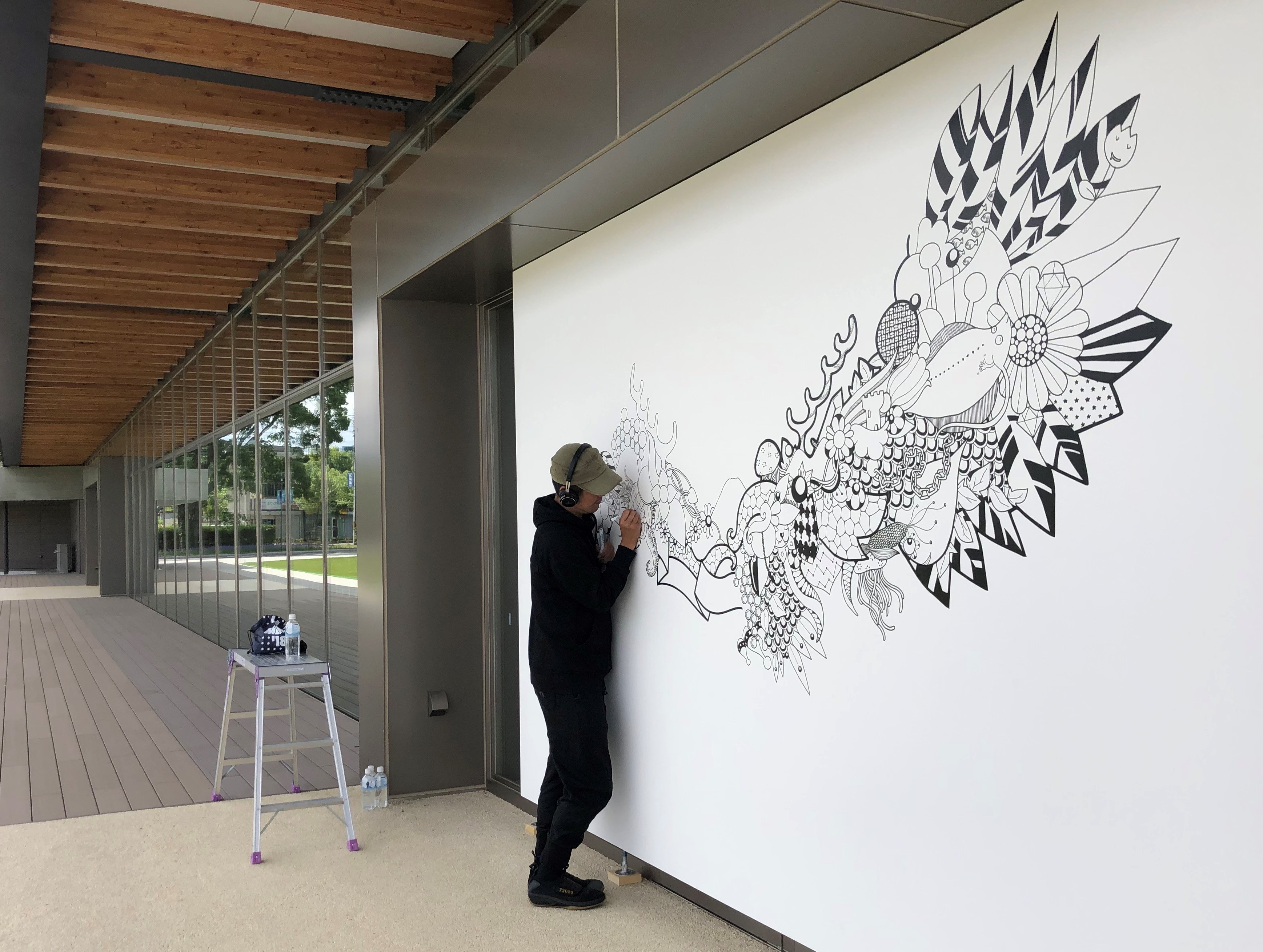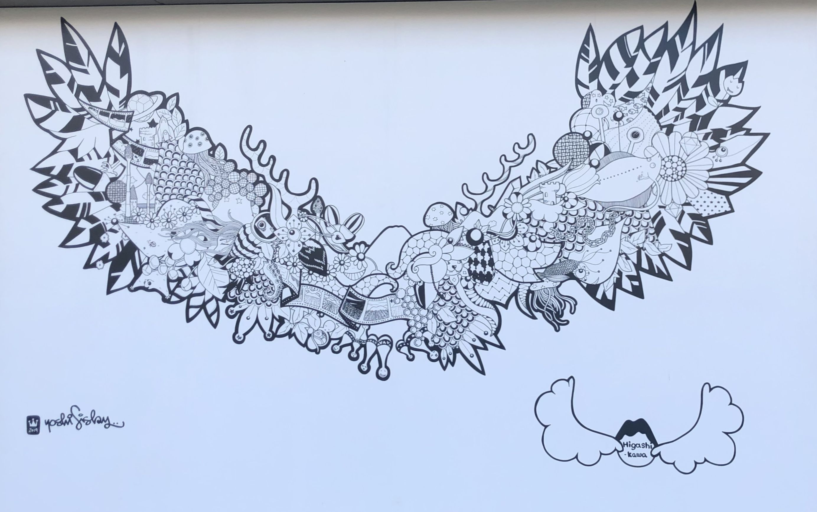 せんとぴゅあの壁画「東川の風景」「東川の翼」でおなじみのアーティスト・Yoshi Sislay氏。再び東川町にやってきてせんとぴゅあの壁面に、即興で新作を描き上げるライブペイントを行います。