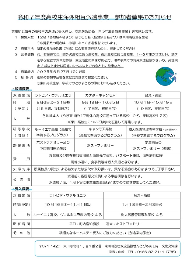 東川町では、語学研修や多文化体験などを通し、青少年のバランスのとれた国際感覚を育成すると共に、国際理解を推進することを目的とし、東川町と良好な国際交流を図っている国・地域へ高校生を派遣し、交流する事業を実施しています。