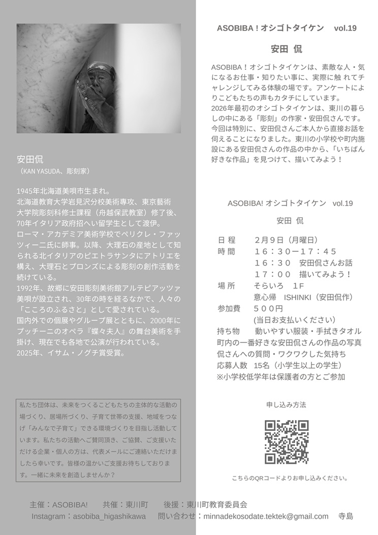 「ASOBIBA!オシゴトタイケンvol.19安田侃」開催のお知らせ