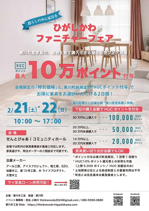 東川町民限定!!東川町産の家具10万円以上のご成約でHUCポイント付与のチャンス!!