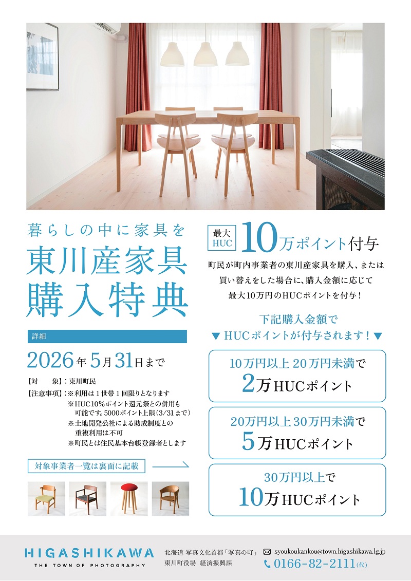 東川町民限定!!東川町産の家具を町内事業者で購入した場合、金額に応じて最大10万HUCポイントを付与!!