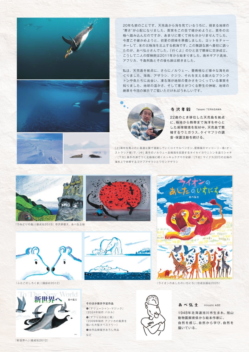 寺沢さんの写真と、あべ弘士さんの原画をはじめとした作品をご覧いただき、2011年から始まった地球環境をめぐる探検の中で感じた地球の温かさ、寒さがつくる野生の神秘、地球の絶景を感じていただければうれしいです。