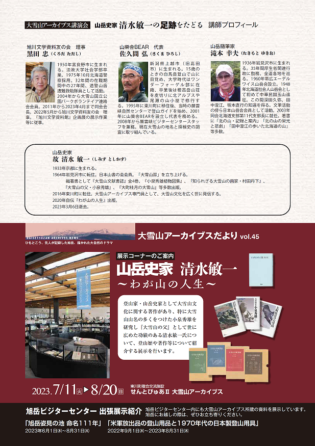 本企画は、今年清水氏が逝去された追悼として実施する企画です。清水氏が晩年情熱を掲げた大雪山アーカイブスでは清水氏を偲び、これまで氏と交流があり、山岳文化に精通した3名の方にその功績や人となりについてお話いただく講演会を行います。